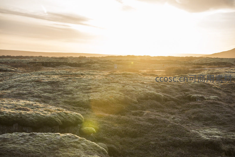 低角度的夕阳光线穿透云层,温柔地照亮覆盖着绿色苔藓的火山岩地表,形成明暗交织的视觉层次与梦幻般的氛围。