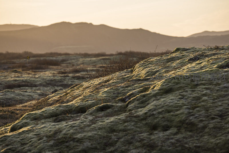 近景的苔藓坡地在低角度夕照下泛着柔润的光泽,层层叠叠的绿色与褐色交织,背景是朦胧的山影,构成一幅温暖而原始的自然图景。