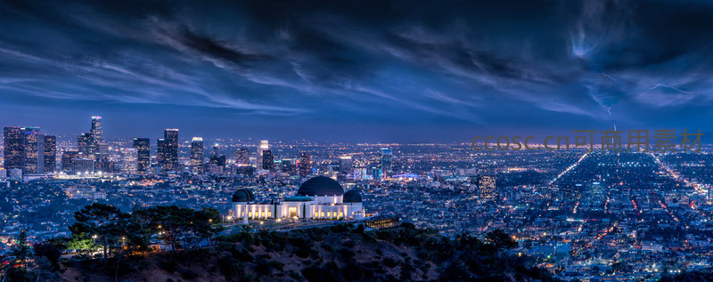 格里菲斯天文台矗立山巅,远处洛杉矶灯火辉煌,一道闪电撕裂乌云,为城市夜景增添了震撼的自然力量。