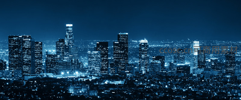 深蓝色调笼罩下的城市夜景,摩天大楼灯火通明,远处万家灯火连成一片,展现出现代都市的宁静与活力。