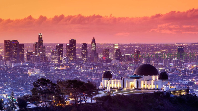 橙红色晚霞映照下,格里菲斯天文台静立山巅,远眺洛杉矶市区灯火初上,古典建筑与现代都市交相辉映,浪漫迷人。