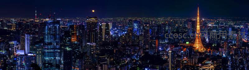 从高空俯瞰东京全城,东京塔在右侧闪耀,一轮明月悬于深蓝夜空,城市灯光如繁星点点,营造出宁静而壮丽的都市夜景画卷。