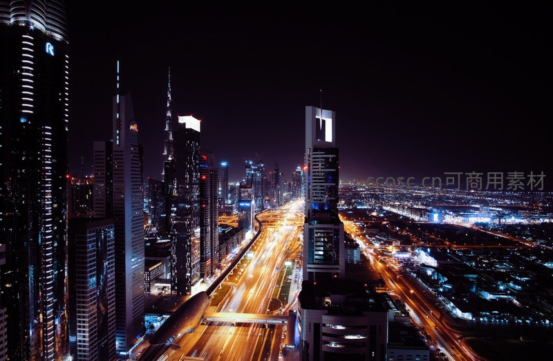 迪拜夜幕降临,哈利法塔与周边摩天楼群灯火通明,高速公路上车灯划出金色光轨,展现这座未来之城的动感节奏与科技感建筑美学。