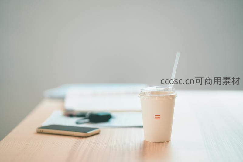 一杯奶茶静静置于木质桌面上,背景是模糊的文件和手机,营造出轻松惬意的工作休息氛围,体现现代人小憩时的生活美学。