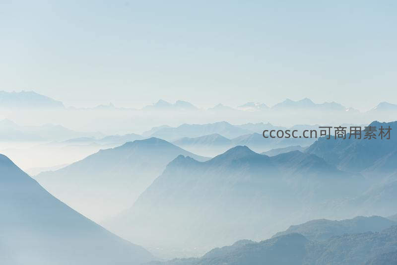 连绵起伏的山峦在薄雾中若隐若现,层次分明,宛如一幅淡雅的水墨画,传递出宁静致远、空灵悠远的自然意境。