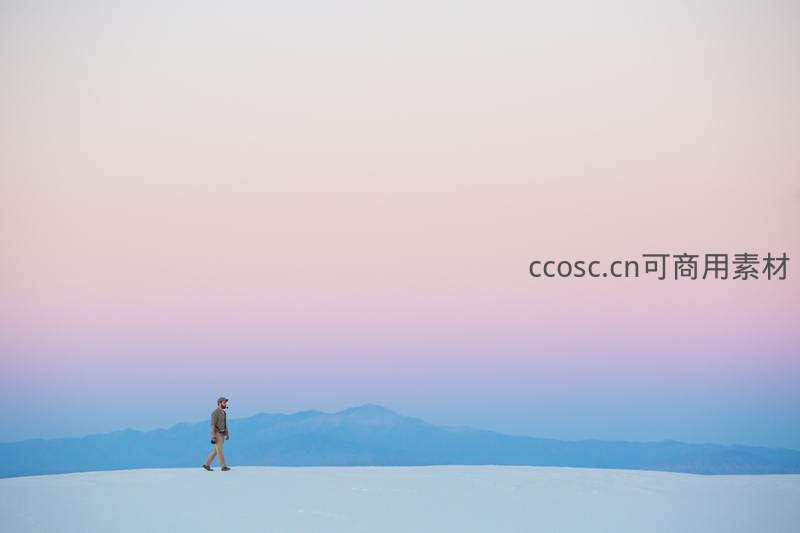 一人独行在无垠的白色盐滩上,背景是渐变的粉紫色天空与朦胧远山,营造出极致的空旷与静谧感。