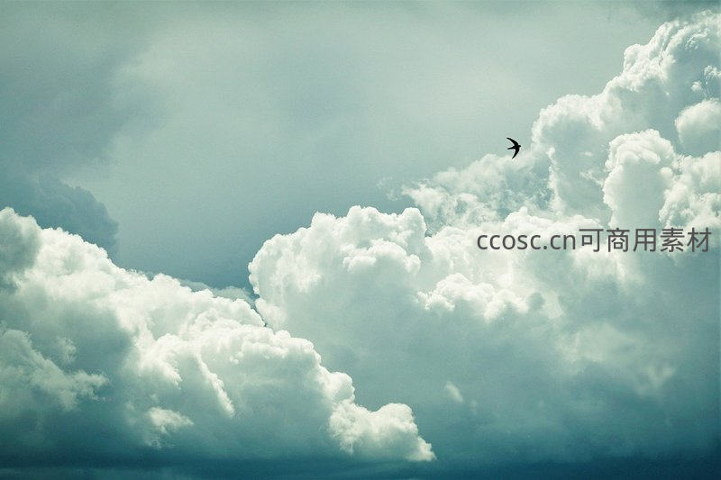 一只孤鸟划过辽阔云海,在灰白与青绿交织的云层间留下剪影,象征着自由与天地的壮阔。