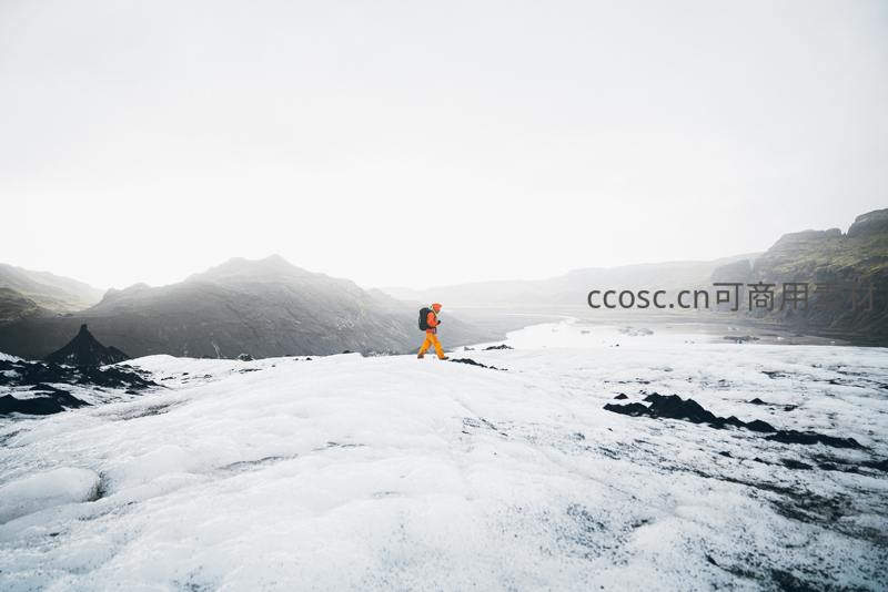一位身着橙色冲锋衣的旅人背负行囊,在灰白苍茫的冰原上踽踽独行,远处山峦起伏,尽显人类探索自然的勇气与渺小。