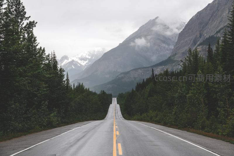 一条笔直的柏油路延伸向云雾缭绕的雪山脚下,两旁茂密的针叶林静谧肃立,营造出一种孤独而壮阔的旅途感。
