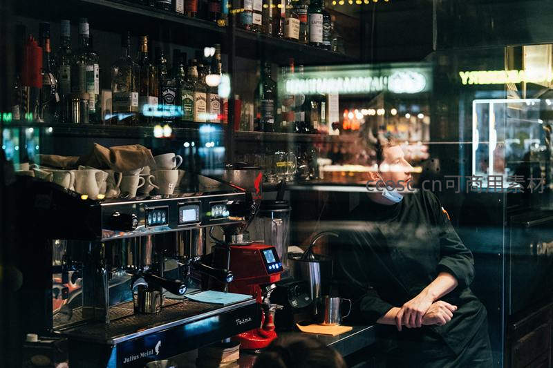 咖啡馆内咖啡师凝望窗外,夜色霓虹映窗