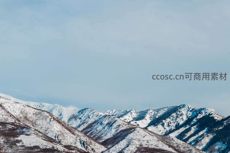 白雪覆盖的山峦在淡蓝色天空下延伸,裸露的褐色山体与积雪形成对比,展现冬季山野的纯净与苍茫之美。