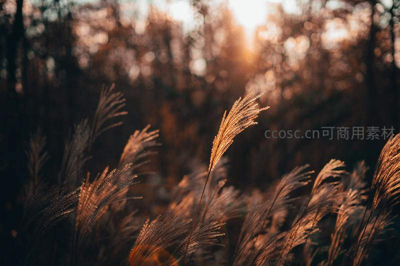 在温暖的夕阳光辉中,芦苇穗被镀上金色,随风摇曳,背景虚化营造出梦幻氛围,展现自然静谧之美。