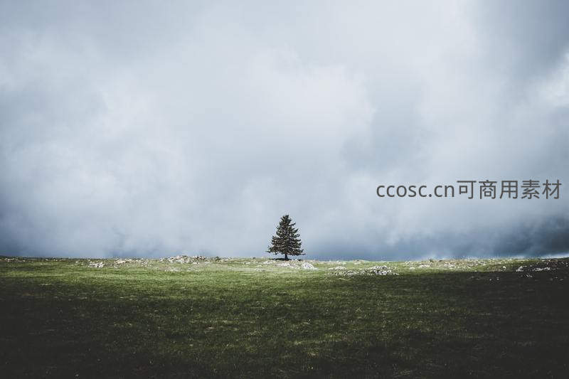 一棵挺拔的松树独自伫立在辽阔的绿色草地上,厚重云层低垂,营造出空灵而略带忧郁的自然意境。