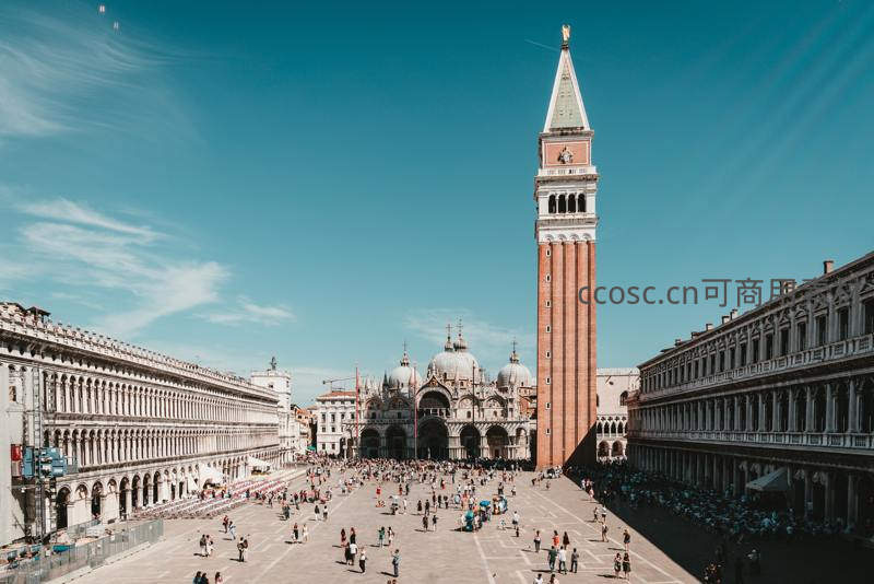 阳光明媚的圣马可广场上游客熙攘,圣马可钟楼高耸入云,古典建筑群环绕,展现意大利水城的历史与活力。