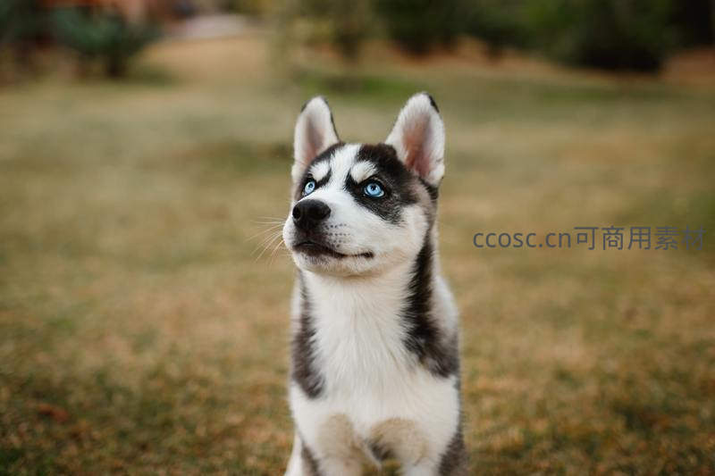 一只拥有迷人蓝色眼睛的哈士奇幼犬坐在草地上,抬头仰望,神情专注而天真,毛发黑白分明,背景虚化突出主体。