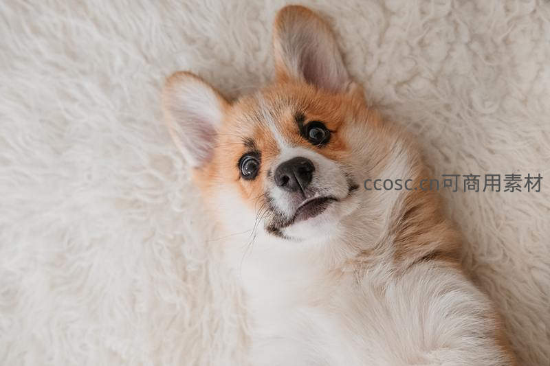一只棕白相间的柯基犬惬意地仰卧在柔软的白色绒毯上,睁着圆溜溜的大眼睛好奇向上看,表情呆萌惹人喜爱。