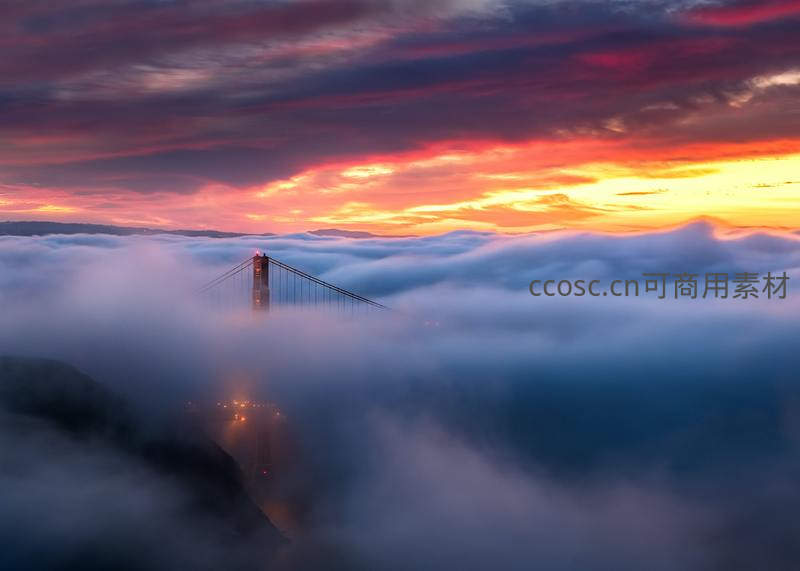 从高空俯瞰,金门大桥的塔尖刺破云海,绚丽的日落霞光将天空染成橙红与紫蓝,下方是流动的云雾,构成一幅壮丽的自然与人文景观画卷。