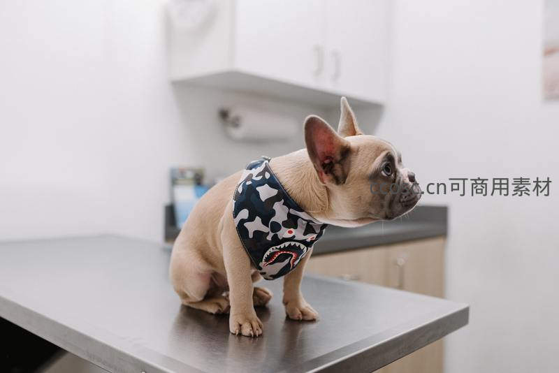 一只浅棕色的法国斗牛犬幼崽坐在金属台面上,戴着蓝白鲨鱼图案的围巾,耳朵竖立,眼神专注地望向一侧,显得既呆萌又充满好奇。