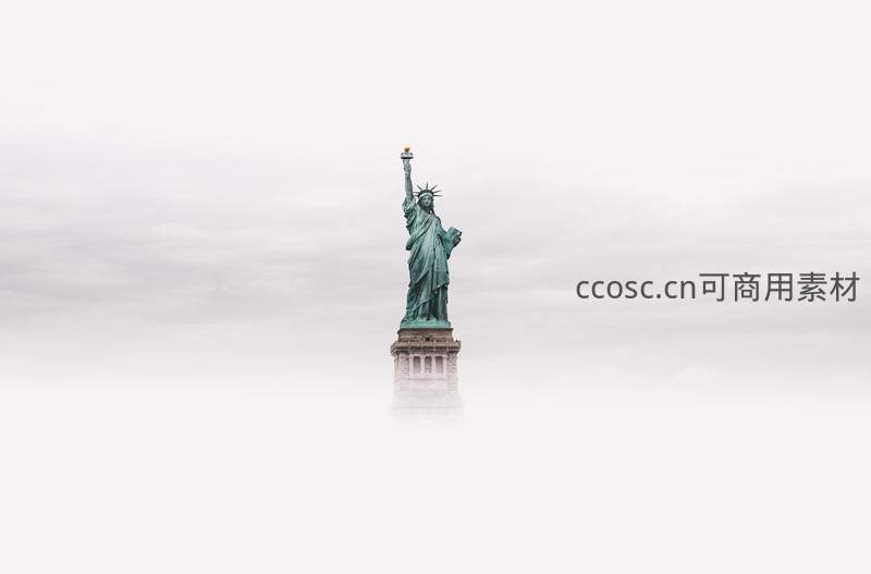 自由女神像在浓雾中若隐若现,仅轮廓清晰可见,铜绿雕像与灰白天空形成强烈对比,散发庄严神秘的历史气息。