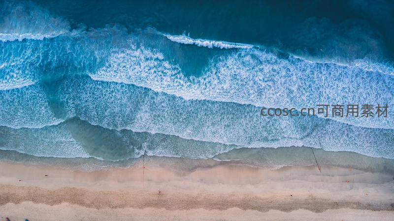 自空中俯瞰,层层叠叠的海浪如丝带般涌向金色沙滩,白色泡沫勾勒出优美的曲线,呈现海洋与陆地交汇处的壮阔与温柔。