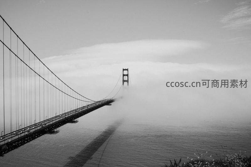 经典的金门大桥在浓雾中仅露出塔身与部分桥面,黑白影调强化了其结构线条与神秘氛围,展现都市建筑与自然力量交融的独特美感。