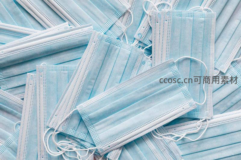 浅蓝色一次性医用口罩杂乱堆叠,白色耳带交错缠绕,直观呈现公共卫生事件中防护物资的重要性和广泛使用场景。