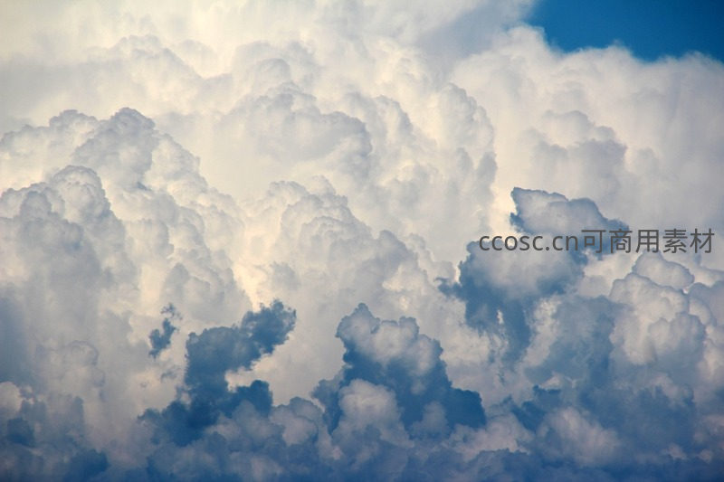 大片绵软蓬松的积云堆叠成山峦状,阳光从侧面勾勒出立体轮廓,在纯净蓝天下展现出自然的柔软之美。