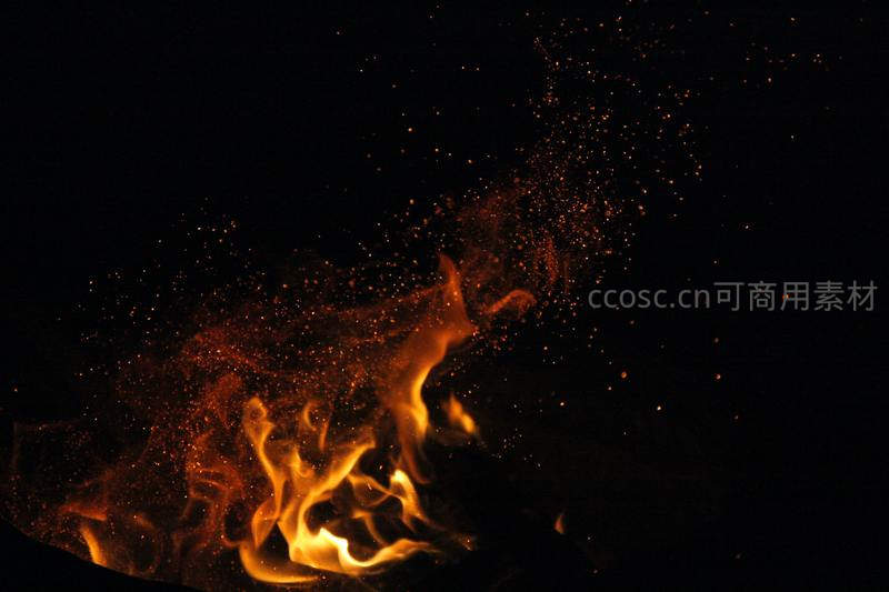 熊熊火焰在纯黑背景下剧烈燃烧,无数橙红色火星如星雨般向上飞溅,展现出原始、炽热且充满动感的生命力。
