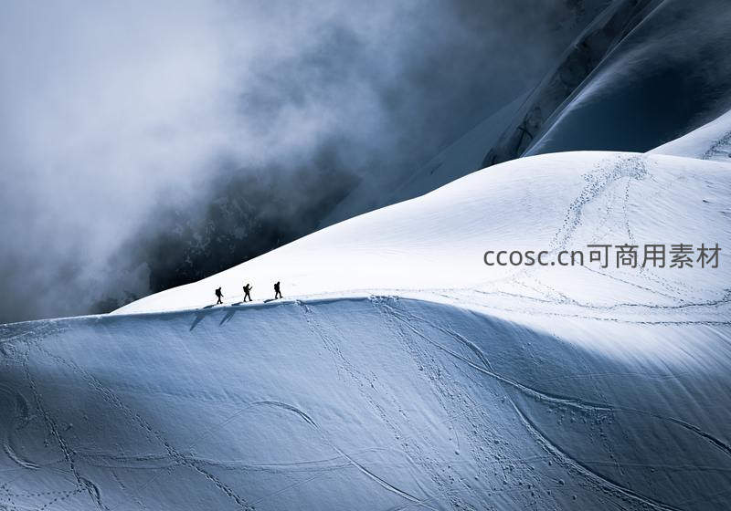 三位登山者在广袤无垠的雪域山脊上留下孤独而坚定的足迹,身后是翻滚的云海和陡峭的冰壁,彰显人类探索自然的勇气。