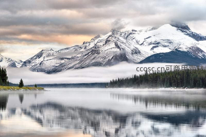 云雾缭绕雪山倒映湖面如镜