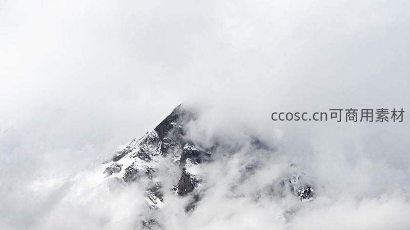 巍峨的雪峰刺破厚重云层,山体覆盖着皑皑白雪,云海翻腾环绕,展现出大自然雄浑壮阔、如梦似幻的高山奇景。