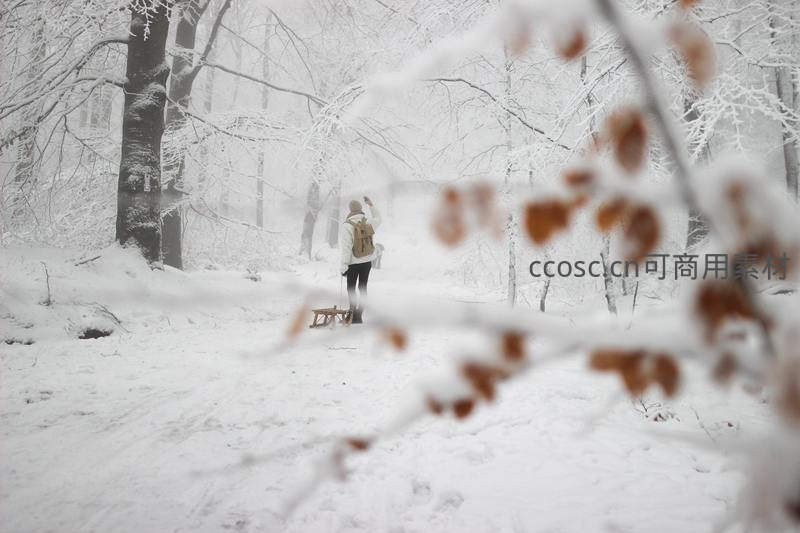 白雪覆盖的树林间,一位背着背包的人正缓缓前行,前景枯枝虚化,营造出冬日森林的静谧感与人与自然和谐共处的画面。