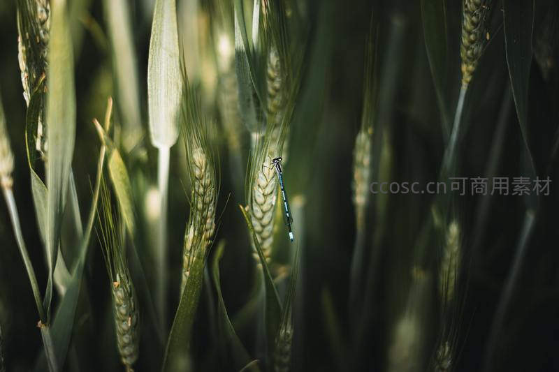微距镜头下,一只蓝色蜻蜓轻盈停驻在青翠饱满的麦穗之上,周围麦浪起伏,阳光透过叶隙洒落,充满生机与诗意。