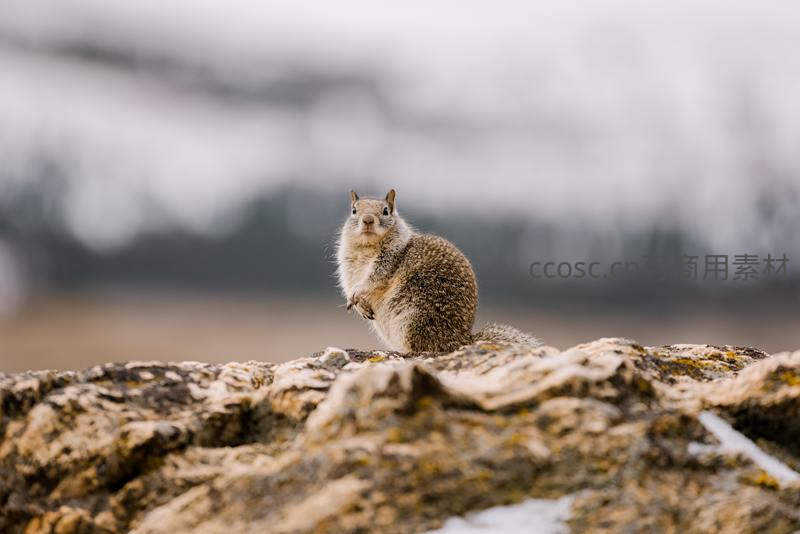 一只毛茸茸的小松鼠站立在粗糙岩石之上,竖起耳朵,眼神机警地环顾四周,背景虚化突出其生动神态与自然野趣。