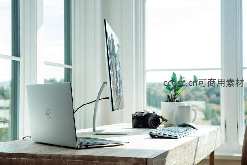 明亮窗边的木质办公桌上摆放着戴尔笔记本、外接显示器和复古相机,绿植点缀其间,营造出舒适高效且充满生活气息的工作环境。