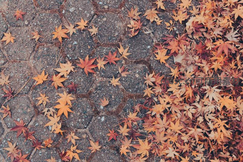 深秋时节,橙红枫叶散落在六角形石板路上,层层叠叠,色彩斑斓,微距视角下展现出季节更迭的细腻纹理与浪漫诗意。