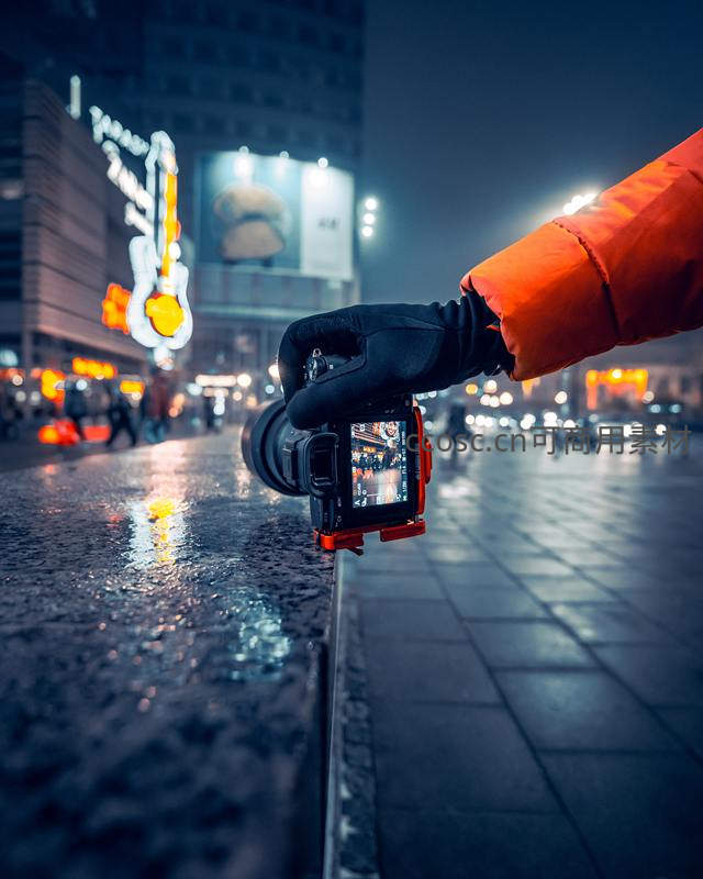 一只戴着黑色手套的手稳稳托住相机,在湿漉漉的都市夜街上,镜头对准远处闪烁的霓虹广告牌,记录着现代城市的光影流动。