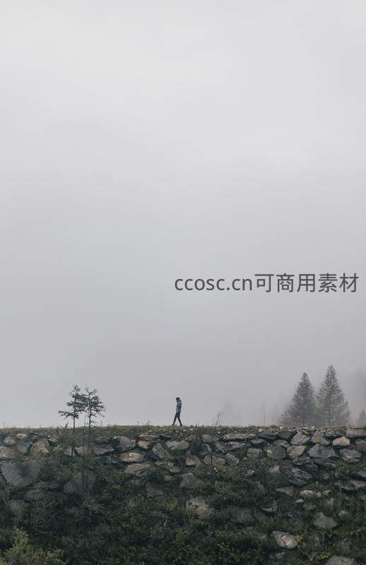 浓雾弥漫的山野中,一人独自漫步于古老的石墙之上,四周松树朦胧,营造出一种神秘、孤寂又充满诗意的氛围。