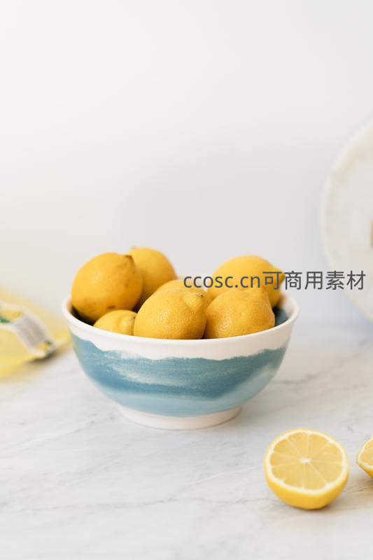 蓝白相间的陶瓷碗中盛放着饱满金黄的柠檬,切开的半颗柠檬点缀一旁,整体构图清新自然,充满健康生活气息。
