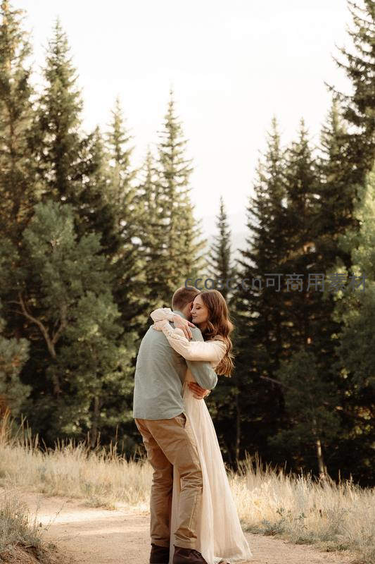 一对情侣在松林环绕的小径上深情相拥,阳光洒落营造温暖氛围,画面充满爱意与自然和谐之美,适合情感与旅行主题。