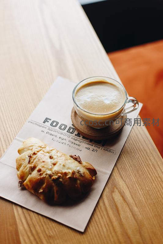 一杯热腾腾的拿铁咖啡搭配香酥可颂,置于木质桌面上,营造出悠闲惬意的下午茶氛围,享受片刻宁静与美味。