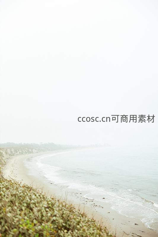 晨雾弥漫的海岸线上,细沙与碧波相接,远处山峦若隐若现,营造出空灵而宁静的自然画卷,令人心旷神怡。