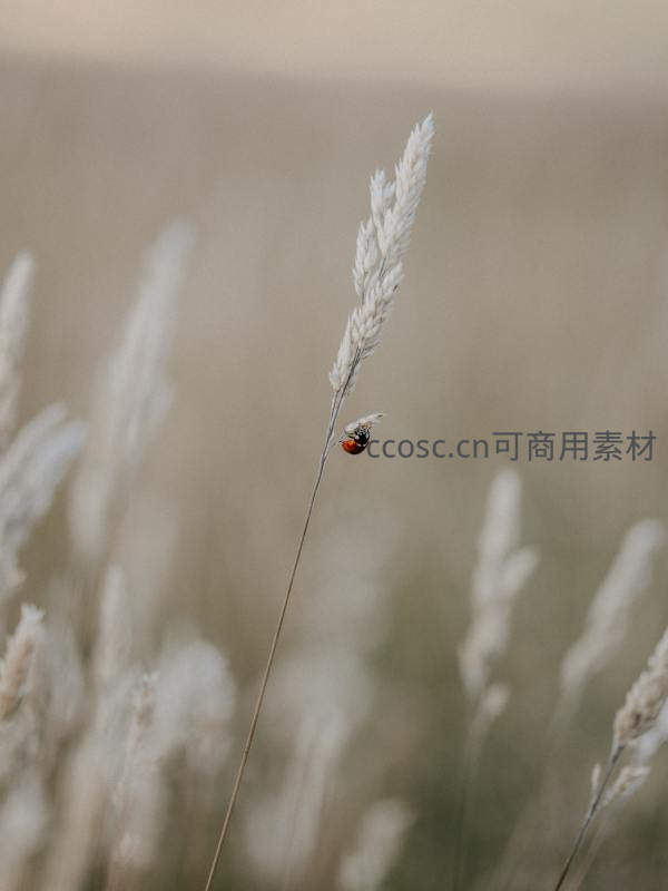 一只红黑相间的瓢虫静静栖息在纤细的干草穗顶端,背景虚化成柔和的暖色调,突显微小生命的精致与自然环境的宁静和谐。