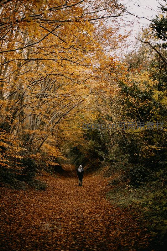一位行者背影融入深秋林道,头顶枝叶交织成天然拱廊,脚下厚厚落叶如地毯般延伸,营造出静谧而诗意的季节氛围。