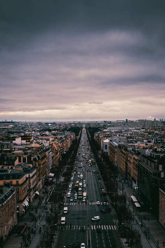 从高空俯瞰宽阔的城市大道,两侧建筑密集排列,车辆川流不息,灰紫色天空低垂,赋予画面沉静而宏大的现代都市气息。