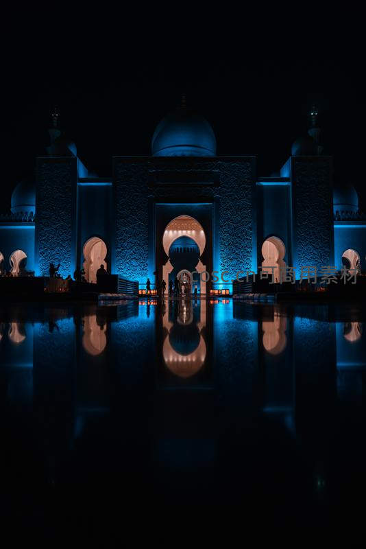 宏伟的伊斯兰建筑在幽蓝灯光下熠熠生辉,前方水池完美倒映穹顶与拱门,营造出神圣、静谧且充满几何美感的夜间视觉奇观。