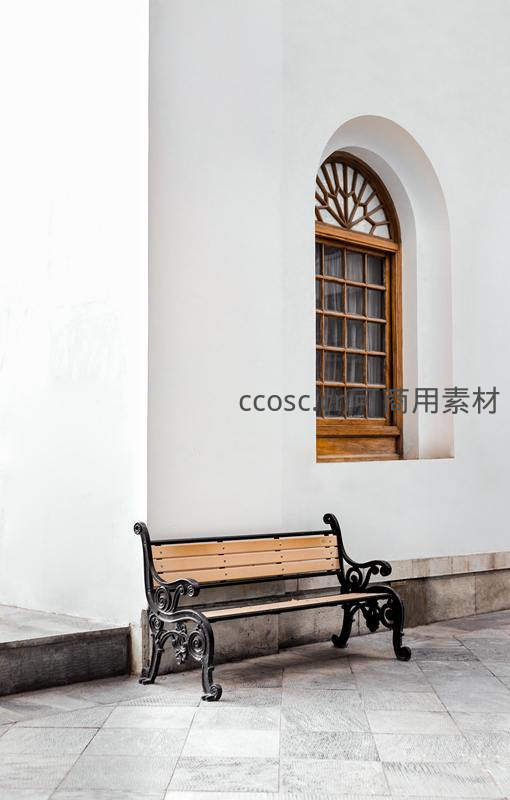 一张雕花铁艺长椅安放于洁白墙面之下,旁边是古典木框拱形窗,整体构图简洁素雅,传递出悠闲、怀旧与空间留白的艺术感。
