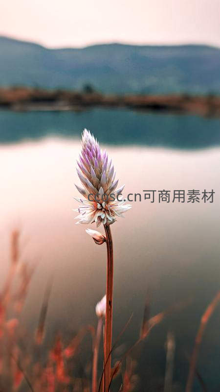 一朵纤细的野花在朦胧湖光山色前静静绽放,粉紫花瓣层次分明,背景虚化柔和,捕捉到自然中最细腻、最温柔的生命瞬间。