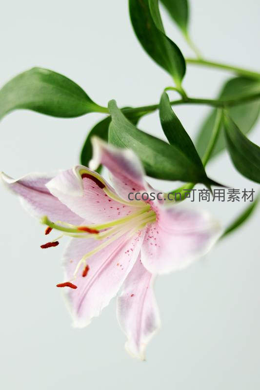 一朵盛开的粉白色百合花,花瓣上点缀着细小红斑,花蕊清晰可见,背景为柔和浅色,绿叶衬托,尽显优雅与生机。