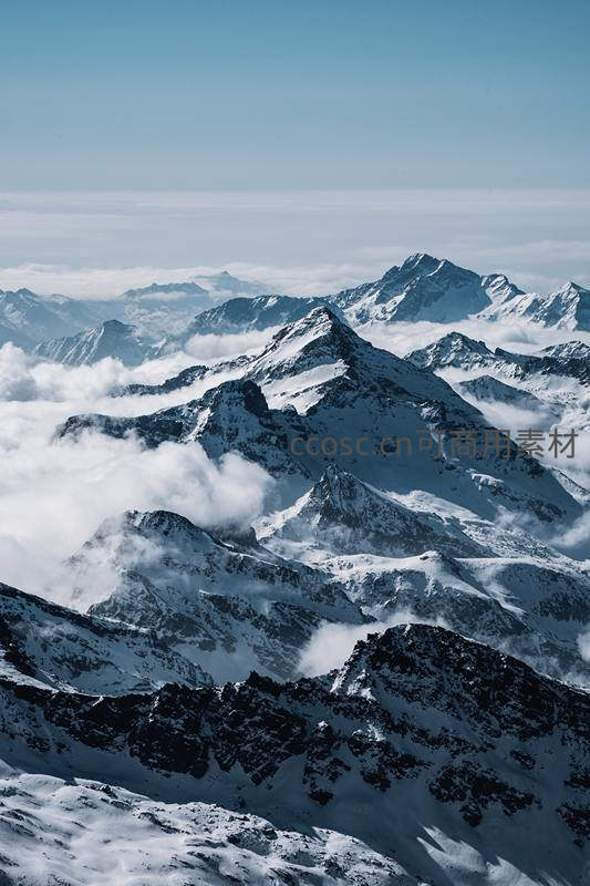 连绵的雪山峰顶覆盖皑皑白雪,云雾在山谷间翻腾流动,蓝天映衬下更显巍峨,展现大自然的磅礴气势与纯净之美。